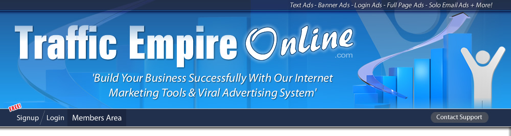 TrafficEmpireOnline.com is not a multi-level marketing scheme or a get-rich-quick program, we are purely an advertising platform. We don't require you to have a website or sell any product to use our service. We do not require you to refer anyone to our site to use our service. You won't get rich by using our internet advertising program. This website uses cookies. Being a member and/or continued use of this website indicates that you accept our cookies policy. Thank you, we very much appreciate your support and being a member on our site! Privacy Center | Terms and Conditions | Earnings Disclaimer | Spam Policy | Privacy Policy © Copyright - TrafficEmpireOnline.com ![]() | ||||||||||||||||||||||||||||||||||||||||||||||||||||||||||||||||||||